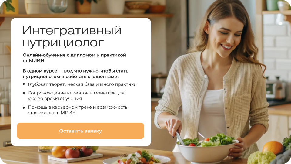 Хотите научиться понимать, как питание влияет на здоровьем и энергию — приглашаем на курс МИИН «Интегративный нутрициолог». В программе — отдельный модуль по работе с дефицитом энергии, протоколы восполнения нехватки микроэлементов и персональный подход к питанию, который вы сможете применять уже сегодня.