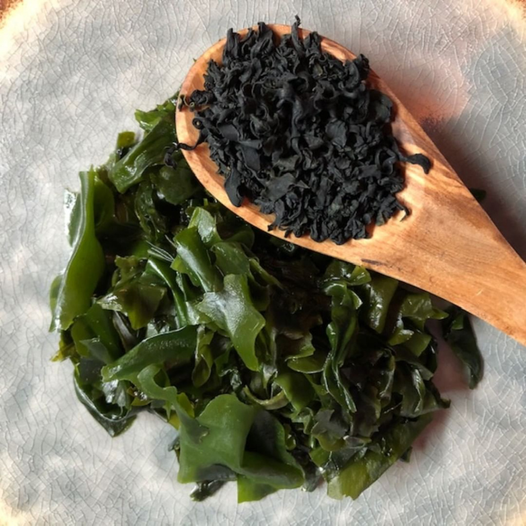 Водоросль вакамэ в свежем и сушеном видах. Источник.